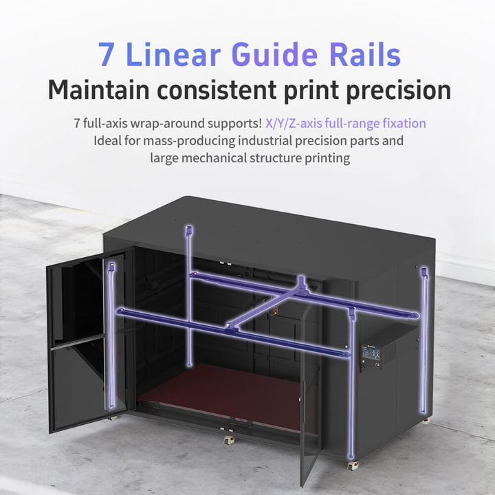 7 volledig omhullende steunen over de volledige as! X/Y/Z-as volledige fixatie. Ideaal voor massaproductie van industriële precisieonderdelen en het printen van grote mechanische structuren.