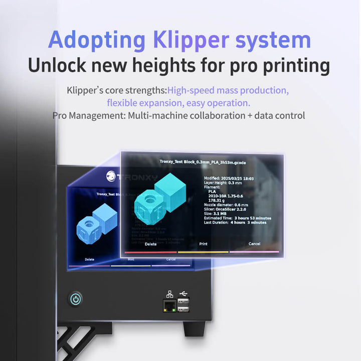 Ervaar geavanceerde prestaties met het onlangs verbeterde Klipper-systeem. Het maakt snelle massaproductie en flexibele uitbreiding mogelijk, wat zorgt voor een efficiënte en gebruiksvriendelijke bediening. Transformeer uw printervaring met naadloos beheer van meerdere machines voor een hogere productiviteit.