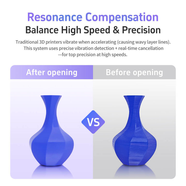 Traditionele 3D-printers trillen bij het versnellen (waardoor golvende lijnen ontstaan). Dit systeem maakt gebruik van nauwkeurige trillingsdetectie en realtime-onderdrukking voor optimale precisie bij hoge snelheden.