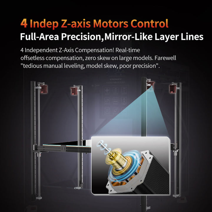 • Quadruple Z Tilt: ด้วยมอเตอร์แกน Z 4 ตัวที่ควบคุมแยกกัน, เครื่องพิมพ์ Pro มีฟังก์ชันชดเชยความเอียงเพื่อให้ได้การปรับระดับอัตโนมัติที่แท้จริง.
